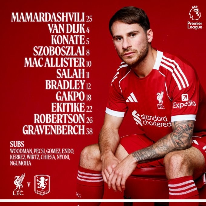 利物浦首发:25号马马尔达什维利、12号布拉德利、5号科纳特、4号范戴克、26号罗伯逊、38号赫拉芬贝赫、10号麦卡利斯特、11号萨拉赫、8号索博斯洛伊、18号加克波、22号埃基蒂克
