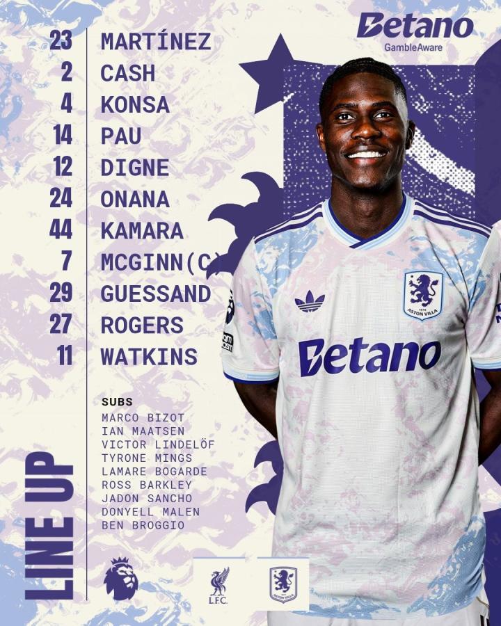 维拉首发:23号达米安-马丁内斯、2号卡什、4号孔萨、14号保-托雷斯、12号迪涅、44号卡马拉、24号阿马杜-奥纳纳、29号盖桑、27号罗杰斯、7号麦金、11号沃特金斯